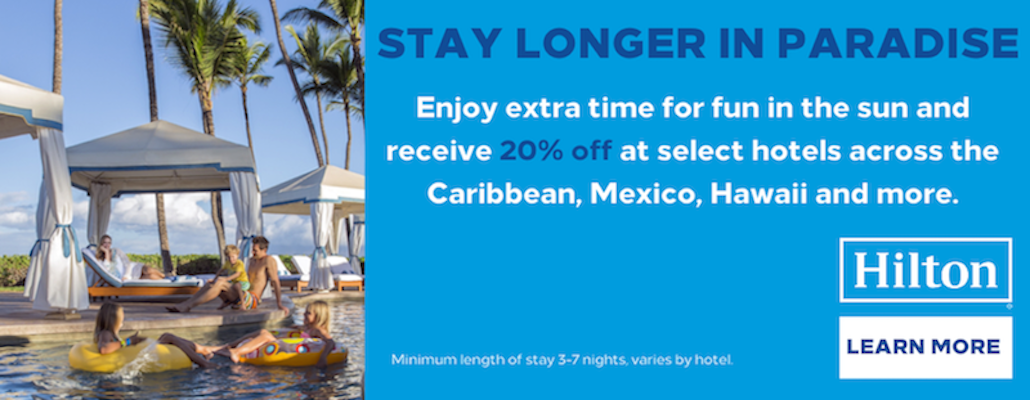 Offer is subject to details stated herein and availability at participating hotels & resorts within the Hilton Portfolio.Offer requires a sixty (60) day advance reservation for the Caribbean, Latin America and Pacific Americas. The minimum stay and discount amount varies at participating hotels and resorts. Discount amount commonly ranges from ten (10) to twenty (20) percent off the Best Available Rate (“BAR”) or Flexible Rate, which is a specific rate type that varies depending on the time of purchase, is unrestricted, non-qualified and excludes discount or negotiated rates. Bookings require a full non-refundable prepayment at the time of booking.Rates will vary based on individual hotels and specific travel dates selected. Unless otherwise stated, quoted rates are per room, per night, based on single/double occupancy and do not include taxes, gratuities, incidental charges and resort fees (if applicable). Participating hotels are subject to change without notice. This offer is not applicable to existing reservations or group bookings, and may not be combined with other select promotions, discounts or offers. Additional restrictions, blackout dates, early departure fees, and deposit and cancellation restrictions may apply and vary by hotel. Unless otherwise noted, all offer components are non-transferrable or redeemable for cash, expire at check-out and may not be used or applied on future stays.We reserve the right to cancel a reservation without notice if we become aware of or are notified of any fraudulent or illegal activity associated with the payment for this reservation. Extensions will require a new reservation for the additional date(s), subject to availability and prevailing rates, and this rate shall not apply. Any currency conversions displayed on advertising are for comparison only.To book by phone within the U.S. or Canada, please call +1-800 HONORS (445-8667) or view Global Reservation phone numbers and request the rate. Hilton Honors™ membership, including earning of Points and redemption of Points, are subject to Hilton Honors Terms and Conditions, available at HiltonHonors.com/terms.